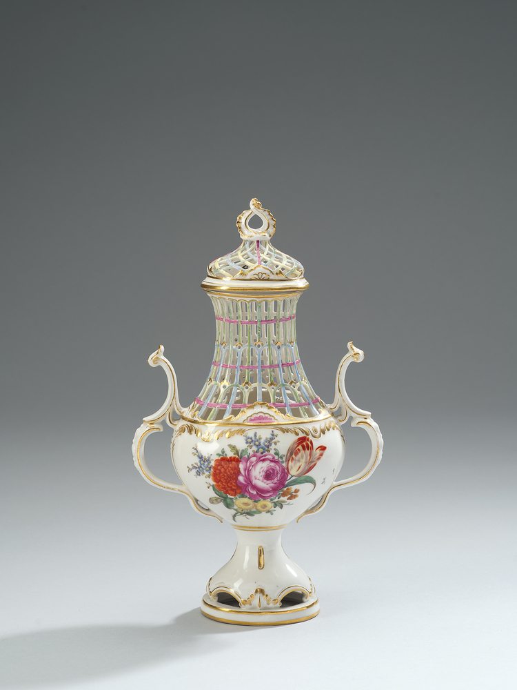 Een set van vijf vazen, waarvan drie met een opengewerkt deksel en wanden. Verguld rocaille ornament in relief. Beschilderd met bloemboeketten. De grootste vaas op de voet met groen geschilderde rocailles. Gemerkt: M:OL.