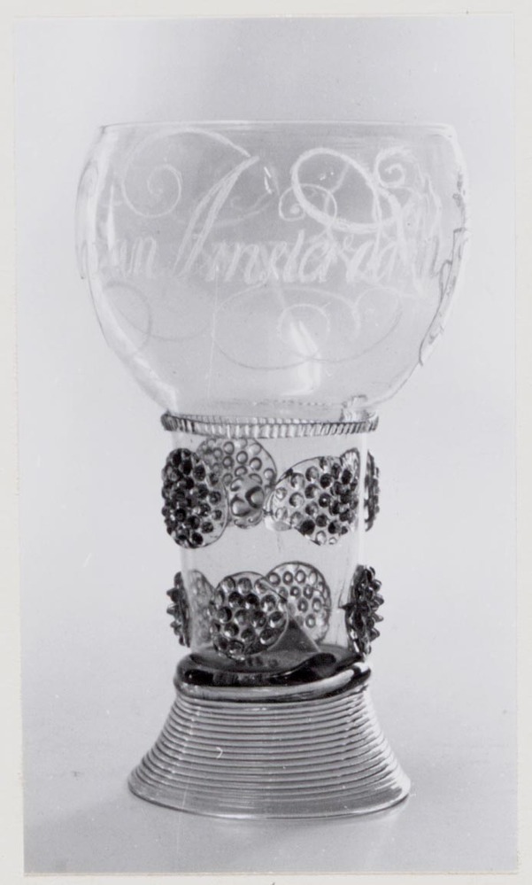 Helder groen glas. Conische voet van gesponnen glasdraad. Ingestoken bodem. Cilindrische schacht met twee rijen braamnoppen, aan één stuk geblazen met bolvormige kelk. Geribde glasdraad op overgang schacht en kelk. Op kelk het gekroonde stadswapen van Amsterdam en het opschrift: De goede Regering van Amsterdam/.