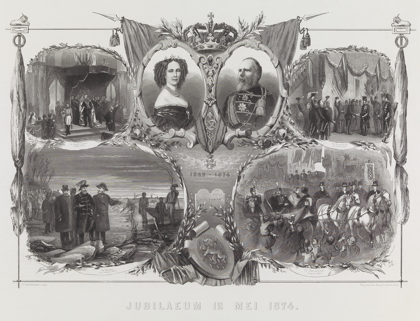- Gedenkprent, gemaakt ter gelegenheid van het 25-jarig regeringsjubileum van koning Willem III (1849-1874), 1864 - 1884