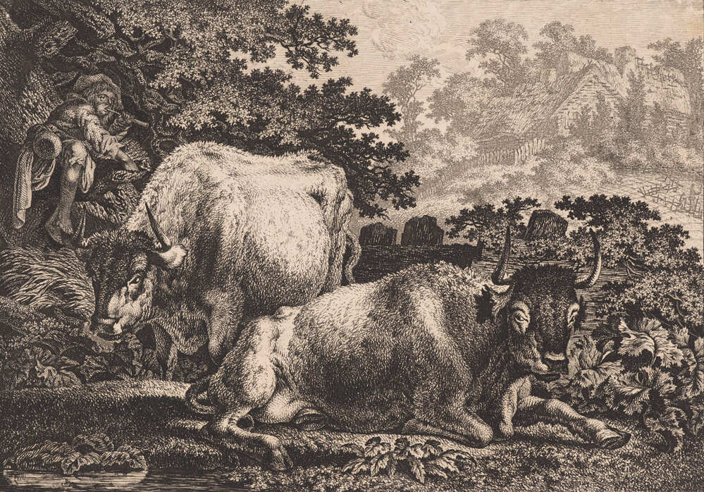 - Landschap met twee koeien op de voorgrond, links een fluitspelende jongen, rechts op de achtergrond een boerderij