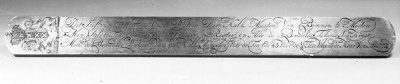 inscriptie bovenzijde: Dit Instrument Is Dienende Om De Wijtens Der Kalk Maaten Van Binnen Te Meeten. Men steld 'T Token Van De Index, of Onder Rigter Op Alle De Bepaalde Tokens Soo Krijgt Men De Bepaalde Wijtens Van 90 Kalk Mingelen Voor De Ton. En 45 Voor De ½ Ton Volgens De Keur Van A° 1773.: gekroonde wapen van Amsterdam, gehouden door 2 leeuwen
