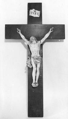 Dit kruisbeeld, dat gezien de stijfheid van uitvoering vermoedelijk in de 19de eeuw is vervaardigd, gaat terug op zeer populaire 17de-eeuwse voorbeelden, die aan François Duquesnoy (1594-1643) worden toegeschreven. ( Michiel Jonker)