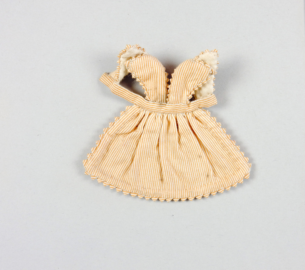 Driehoekig schortje van katoen, overgooiermodel. Splitjes op de schouders. Het onderstuk is gerimpeld op bandje a.h. middel, dat achter gesloten wordt. Het geheel is versierd met een picótje van hetzelfde materiaal, waarlangs a.d. achterkant een wit voerinkje is aangebracht. Dito voerinkje langs bovengedeelte.