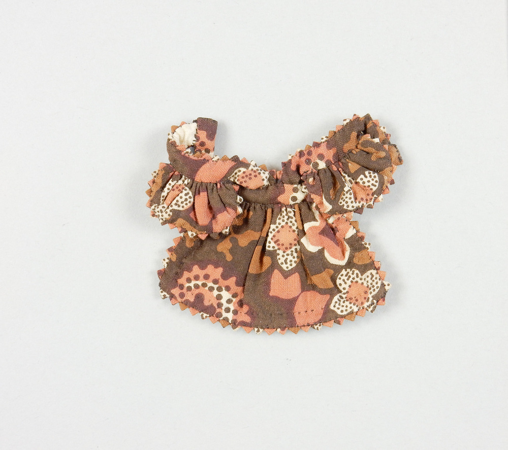 Driehoekig schortje van katoen, met schuine bretels, waartegen schouderflapjes (epauletten). Het schortje is ruim ingerimpeld op bandje a.h. middel, dat achter gesloten wordt. De ronde flapjes zijn ingerimpeld op de bretels. Het geheel is afgewerkt met picótje van hetzelfde materiaal, als versiering. Aan de achterkant gevoerd met wit voerinkje langs de randen en bovenstukje.