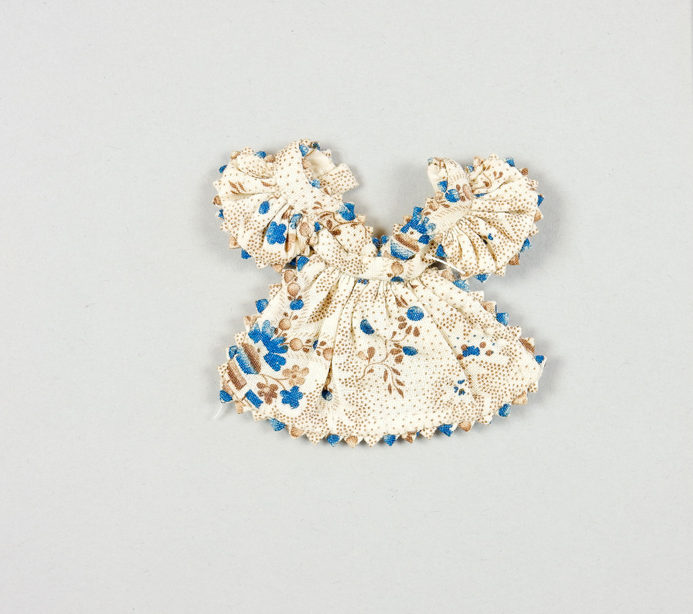 Driehoekig schortje van katoen, met schuine bretels, waartegen schouderflapjes (epauletten). Het schortje is ingerimpeld op bandje, dat achter gesloten wordt. De ronde schouderflapjes zijn ingerimpeld op de bretels. Het geheel is afgewerkt met picótje van hetzelfde materiaal, als versiering, en langs de binnenranden gevoerd met wit bandje. Ook het gehele bovenstukje gevoerd.