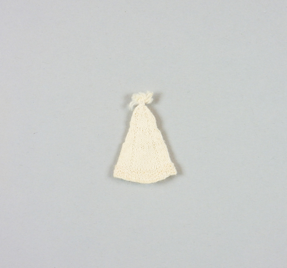 Puntmutsje van katoen met kwastje bovenop. De onderrand is in gerstekorrelsteek gebreid. Versierd met verticale naadjes overlangs.