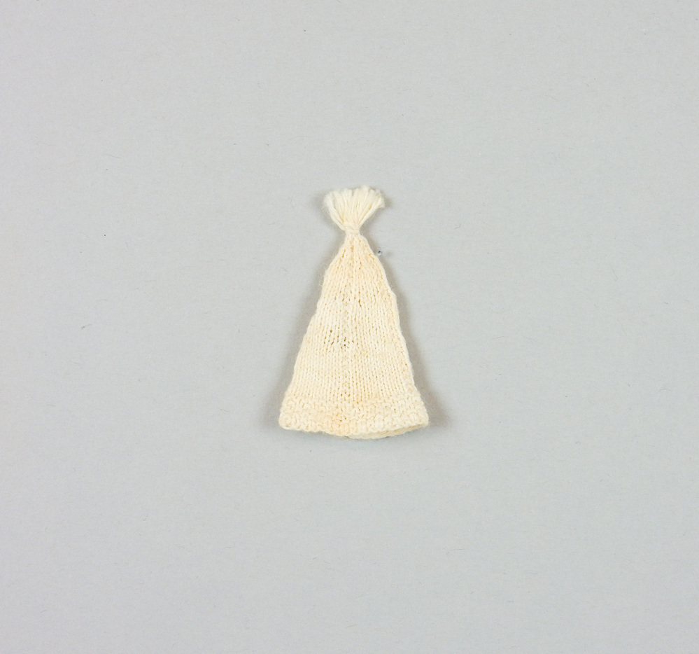 Puntmutsje van katoen met kwastje bovenop. De onderrand is in gerstekorrelsteek gebreid. Versierd met verticale naadjes overlangs.