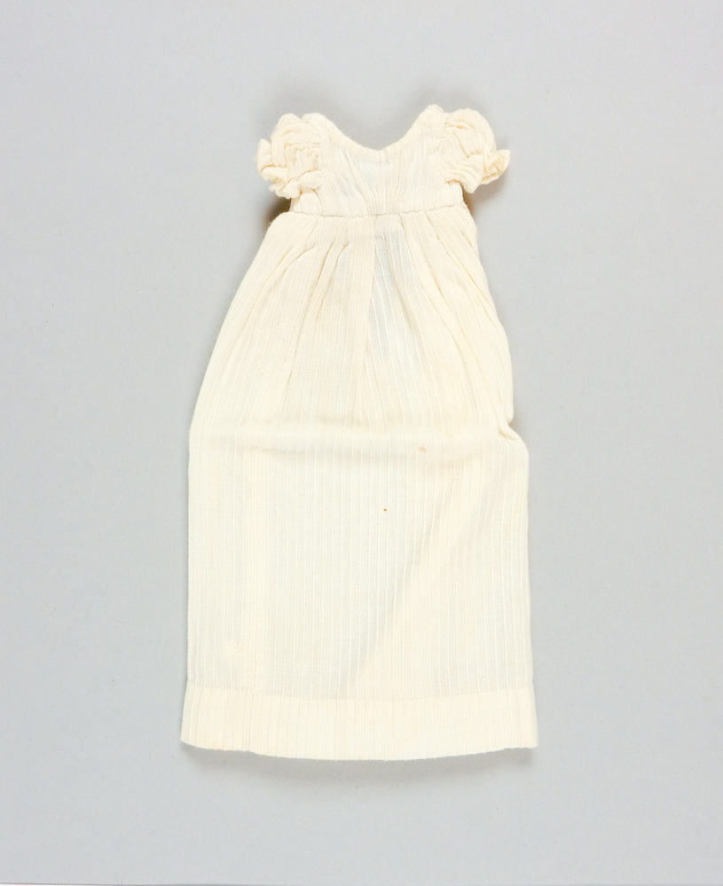 Onversierd jurkje van katoen. Lijfje en onderrokje ingerimpeld op taillenaad. Zeer wijde boothals, achter ingehaald door wit koordje. Korte pofmouwtjes ingerimpeld op ruim strookje onderaan. De rok heeft een brede onderzoom.