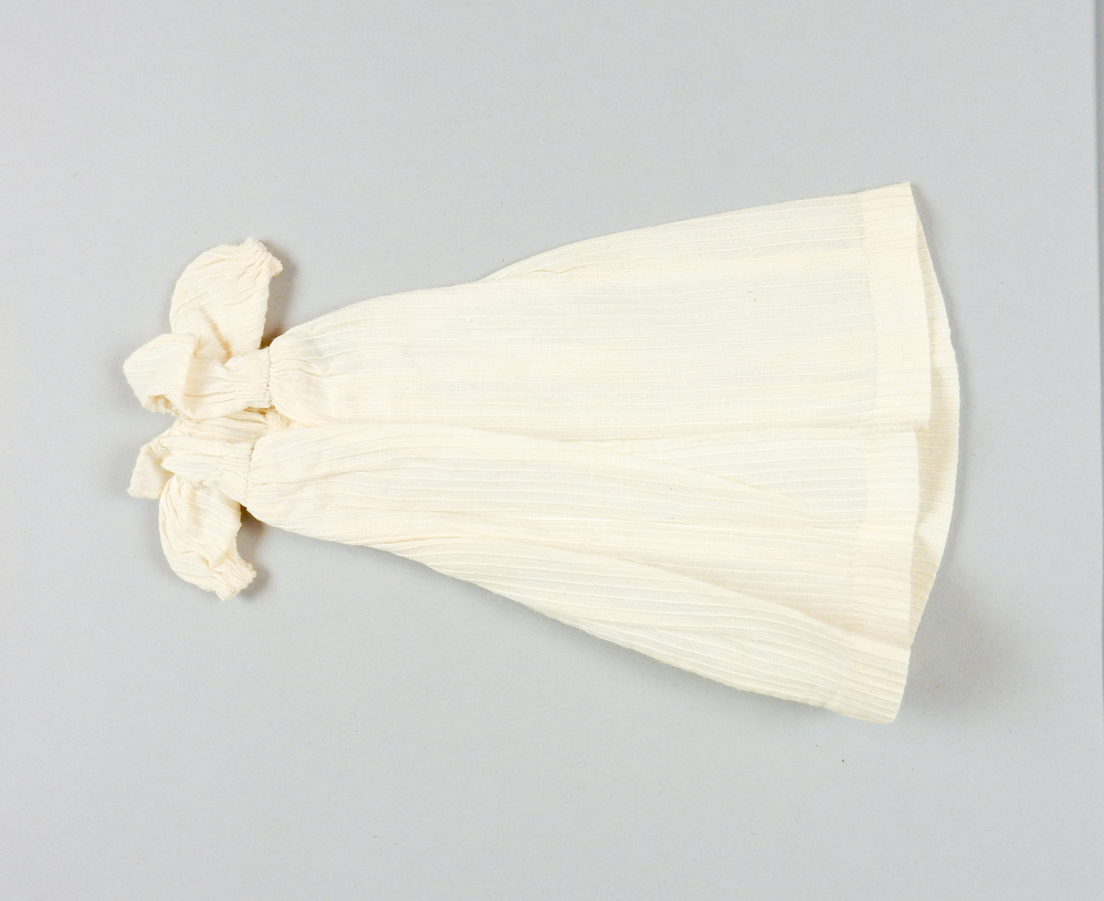 Kort lijfje en lang onderstuk van katoen ingerimpeld bij 't middel. Achter meeste ruimte in de rug. Vóór geopend, met ronde kraag en halflange kopmouwtjes, onderaan ingerimpeld. Gérend model. Bijzonderheden: Empire stijl. Werd over lang doopjurkje (no: KA 12425) gedragen, van dezelfde stof en maten.- Trefwoorden
