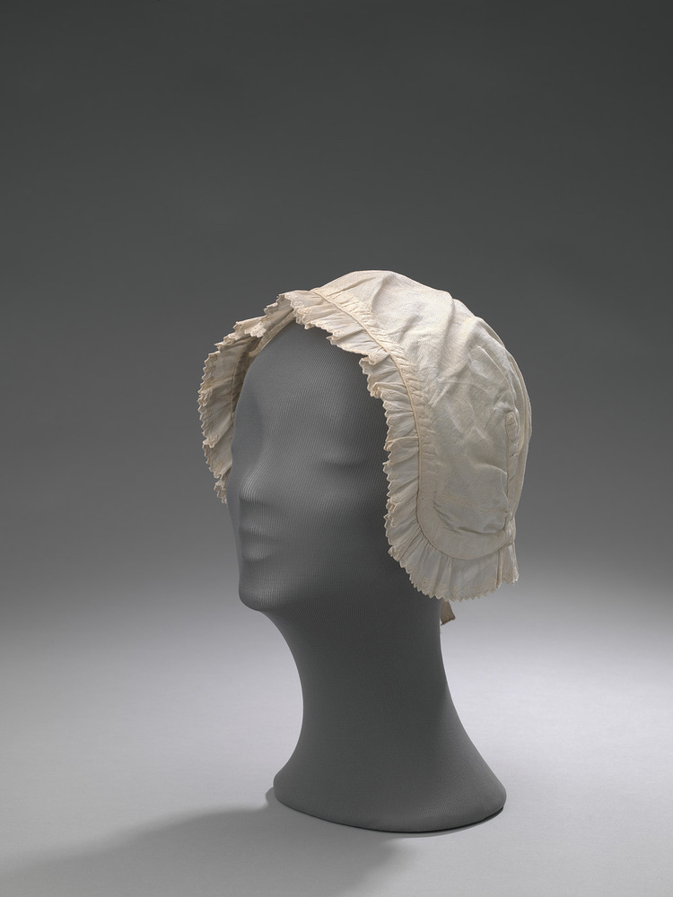 Witte katoenen nachtmuts met ingeweven wafelpatroon met gerimpelde rand van geborduurde piqué katoen. Van binnen in te halen. Initialen: HW 6. Zie ook KA 12608 en KA 12609.