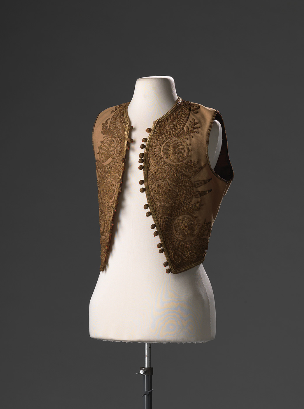 Donkerbeige laken armloos vestje (bolero) met rijke goudtres versiering, middenvoor geopend, langs beide voorpandjes (resp.15 en 16) kogelvormige bolletjes van gevlochten gouddraad met bovenop donkerroze kraaltjes versierd. Het geheel is afgezet met dubbele rij van goudtres langs de rand en een enkele langs armsgaten.