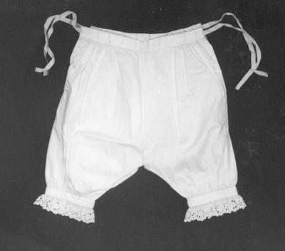 Witte, onderbroek, pofbroek model. Bovenaan broekbandje met 2 splitten opzij, sluiting: 2 linnen bandjes opzij aan beide kanten van de split. De pijpen zijn tegen bandje ingerimpeld en onderaan afgezet met kantje van engels borduurwerk. Met rood gemerkt: “DR6” bij de linker zij split.- Trefwoorden