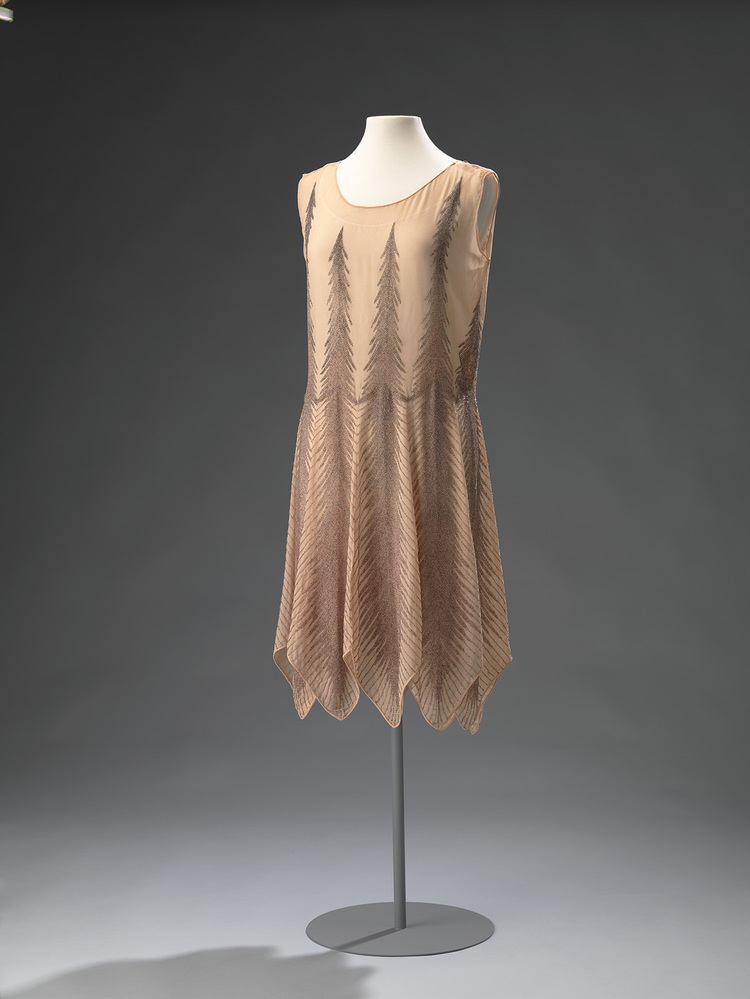 Modieuze jurk. De punten langs de rok passen in de periode 1925-1930.
