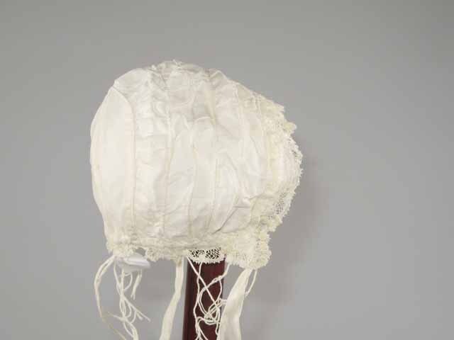 Wit doopmutsje van batist, geheel overdekt met florale, geborduurde motieven (au plumatis en àjour). Op de kruin rond inzetsel van zelfde borduursel, omgeven door smal handgeklost kantje. Rijssels (Lille). Rondom de muts twee strookjes ingerimpelde kant. Langs de gehele voorrand lusvormige toefjes van wit babylint op kanten ondergrond aangebracht. Aan weerszijden een zijden lintje, dat om het gezicht wordt dichtgestrikt. Achter ingehaald en dichtgestrikt door twee koordjes. Ondermutsje van crème batist met hoefvormige bol, brede pas met vijf opnaaisels, waardoor koordjes gehaald zijn om het mutsje in te rimpelen. Rondom versierd met gekloste rijsselse (Lille) kantjes, voorop twee, achter één kantje. Aan weerszijden een batisten bandje, dat om het gezicht wordt vastgestrikt. Aan de achterkant een schuifje, waardoor koordje gehaald.