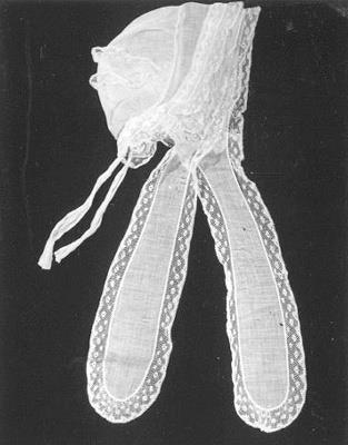 Witte muts met kleine bol met slippen die los horen te hangen. Kant langs bol en slippen. Band om muts aan te trekken langs binnenrand onderzijde. Huismuts voor een getrouwde vouw.- Trefwoorden