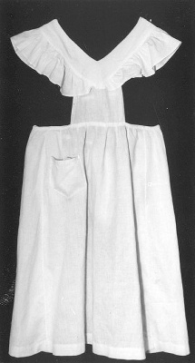Vermaakte witte schort. Tailleband is vermaakt, waardoor er voor de gekruiste schouderbanden geen knoopsgaten zijn.- Trefwoorden