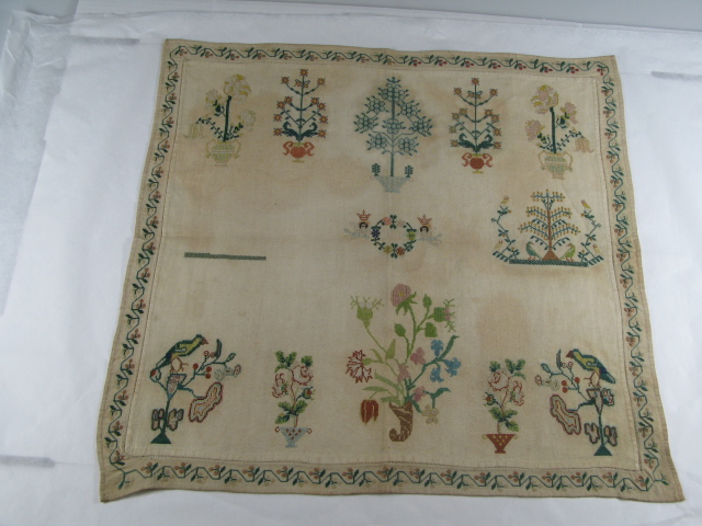Deze laat achttiende-eeuwse borduurlap is van hoge kwaliteit. De borduurster en de herkomst zijn onbekend. Het is niet duidelijk of de doek het resultaat is van handwerkonderwijs, waar de meisjes leerden met handwerken in hun levensonderhoud te voorzien of dat de doek vervaardigd is door een borduurster van goeden huize onder het toeziend oog van haar moeder, een handwerklerares of een gouvernante. Borduren als aangenaam tijdverdrijf voor dames. Het jonge meisje of de jonge vrouw werkte met zijden garen op een katoenen stof met ingesponnen linneneffect in de stofdraad. De afmeting van de doek met rand bedraagt 47 bij 50 cm. Het werk is symmetrisch opgebouwd. Op de middenas zijn van boven naar beneden een vaas met een bloeiende egelantier, twee zwevende en gekroonde engelen met bloemenkrans en een hoorn des overvloeds weergegeven. De egelantier komt net als de tulp, de roos en de anjer veelvuldig voor op merklappen, los, geschikt in vazen of verwerkt in gestileerde bloemenbomen. De hoorn des overvloeds, de hoorn waaruit het goede der aarde overvloedig stroomt, bevat verschillende bloemsoorten waaronder een blauwe gentiaan. Links en rechts van de egelantier zijn twee orenvazen met bloemen aangebracht. Zij spiegelen elkaar. Dat geldt ook voor de vogeltjes op bloementak en de driehoekige vaasjes of manden met rozen. Hier en daar zijn er kleine kleurverschillen. Deze doek behoort tot de vroegste doeken waarin door middel van schaduwwerking getracht wordt diepte in de motieven, zoals de bloemen, aan te brengen. Dit kwam in de laatste kwart van de achttiende eeuw in zwang. Rechts van de engelen op de middenas bevindt zich een gestileerde boom op een ondergrondje, met links en rechts daarvan twee ruggelings naar elkaar toegekeerde vogels. Links ervan is enkel het grondje weergegeven. De symmetrische opbouw doet vermoeden dat dit grondje de aanzet is voor een spiegelbeeldige kopie van het motief aan de rechterzijde. Het geheel wordt omgeven door een zigzagrand met klavertjesdrie. Deze rand is met fijne opengewerkte steekjes vastgezet aan de doek.