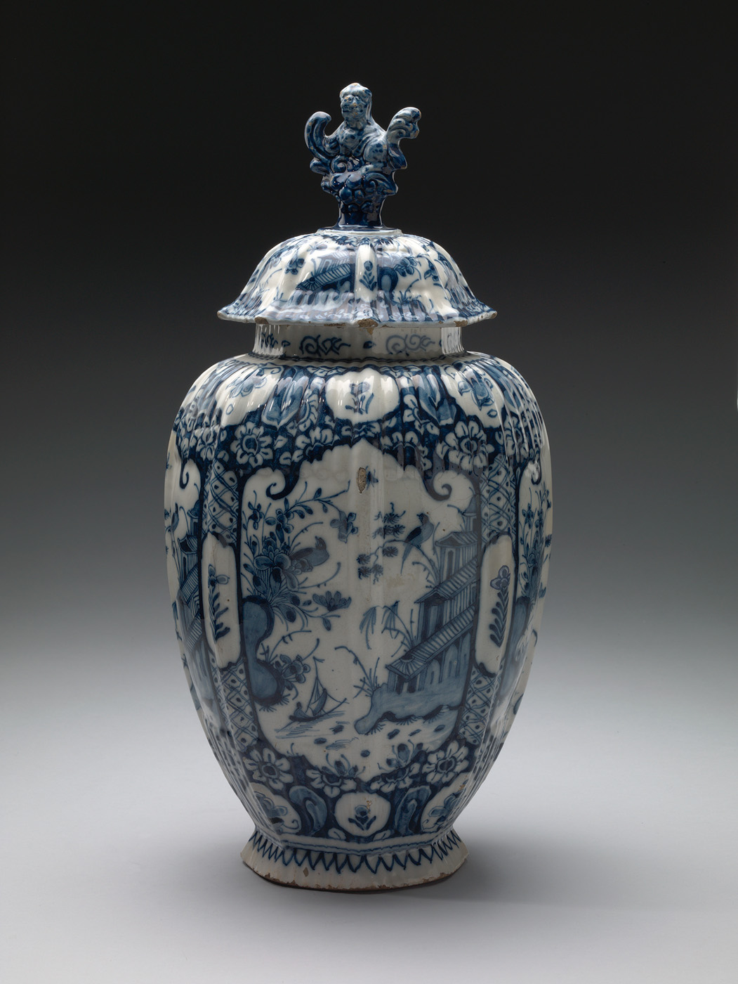 Vaas met deksel met dierfiguur als knop; blauw en wit Chinees decor, huis met bootje aan een rivier, vogels en bloemen.