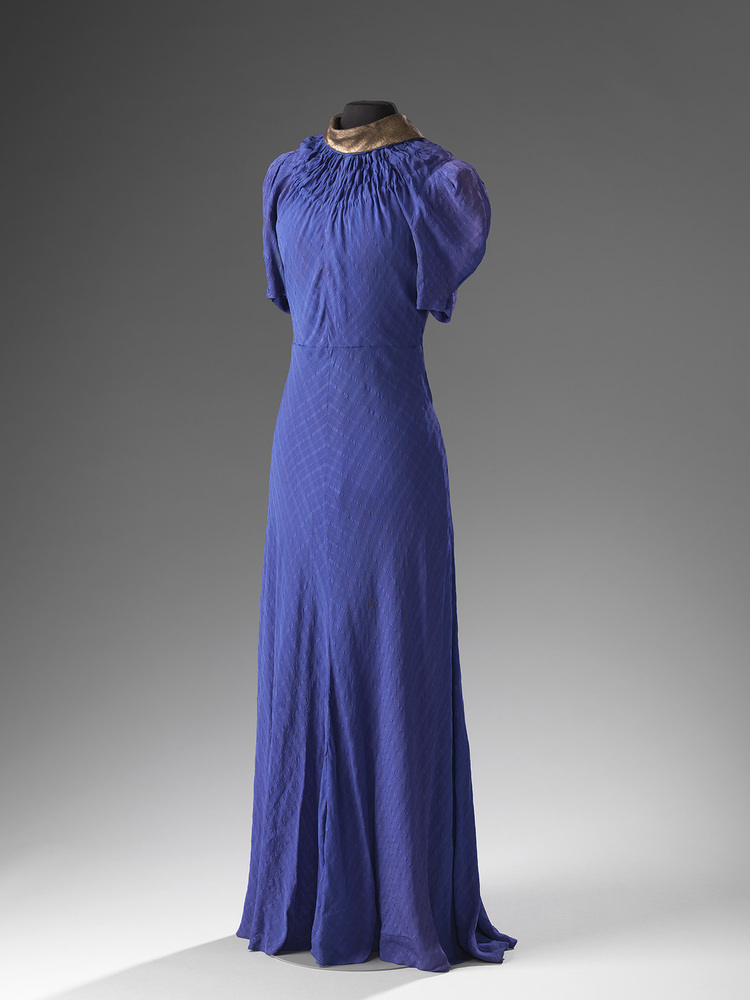 Paarse, schuingeknipte avondjurk met gouden draad en ingeweven streep. Goudkleurige boord, waarvan de sluiting middenachter met drie knoopjes is. Onder de boord een ingerimpelde hals. Korte pofmouwen met schoudervullingen. De mouw is relatief groot door de schoudervulling voor de periode 1935-1940. Sluiting met drukknopen links in de taille.