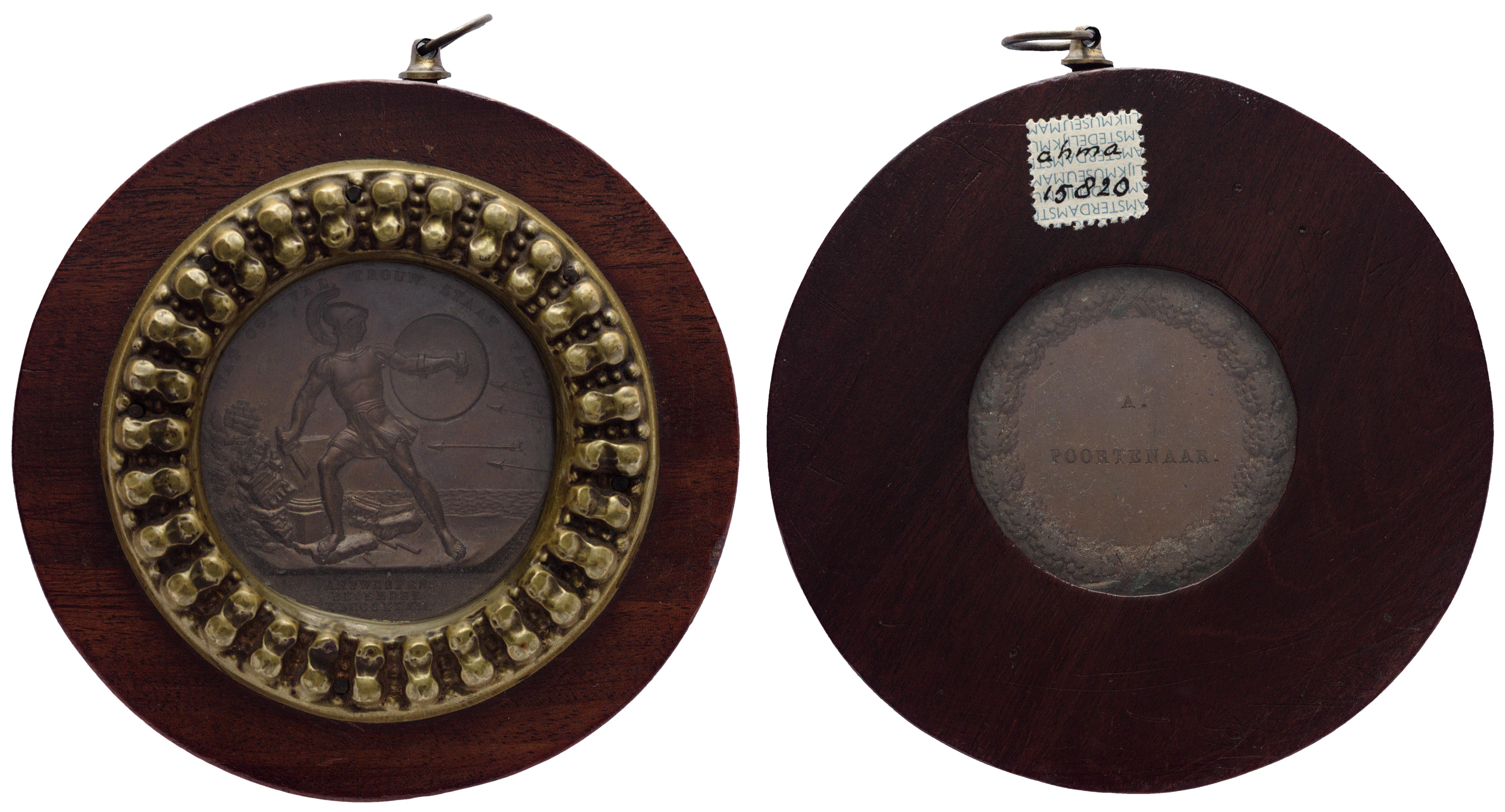 ingelijste penning met als voorstelling in reliëf een Romeinse krijger, die van rechts met pijlen wordt bestookt; hij staat naast een stuk zuil en neervalend muurwerk