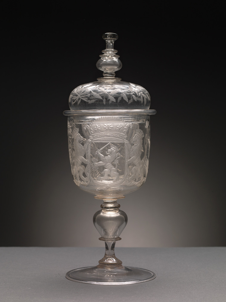 De gravering heeft mogelijk betrekking op de kroning van stadhouder Willem III (1650-1702) tot koning van Engeland in 1689. Het Rijksmuseum te Amsterdam en het Haags Gemeentemuseum bezitten soortgelijke kelkglazen, echter met afwijkende graveringen en zonder deksel (Ritsema van Eck 1995, p. 179 nr 185 afb.; Catalogus 1962, p. 83 nr 133). ( Bert Vreeken)