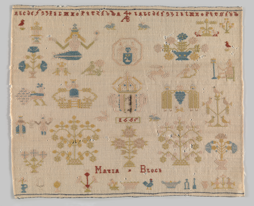 Anthonij Block, lakenhandelaar en de vader van Maria de borduurster van deze doek, wordt in 1620 geboren in een welvarende, doopsgezinde familie, die fortuin heeft vergaard in de textielhandel. Anthonij heef één broer en drie zussen, waaronder Agnes Block (1629-1704), de eerste botanicus in de Republiek die erin slaagde een vruchtdragende ananasplant te kweken. Zij heeft zich samen met man, twee kinderen én ananas laten vereeuwigen door de schilder Jan Weenix. Dit schilderij bevindt zich in de collectie van het museum (SA 20359). Anthonij’s vader Arend Block overlijdt in 1635, zijn moeder Ida Rutgers tussen 1632 - het geboortejaar van haar jongste kind Ida - en 1646. Na de dood van hun ouders worden de kinderen Dirck, Anthonij, Nelletje, Agnes en Ida opgenomen in het gezin van David Rutgers, de broer van hun moeder en diens vrouw Susanna de Flines. Anthonij trouwt op 14 september 1646, met zijn achternicht Barbera Leeuw (1629-1682). Zij brengt behalve een stamhouder, in 1653 Maria ter wereld. In 1665 voltooit hun twaalfjarige dochter deze merklap, mogelijk onder het toeziend oog van haar moeder, een huislerares of gouvernante. De doek draagt naast diverse merklapmotieven en het stadswapen van Amsterdam ook het wapen van de familie Block en het merkteken van Anthonij, dat aan de bovenzijde tussen de gotische alfabetten is aangebracht. Zo’n persoonsgebonden merk is een teken dat doorgaans uit rechte lijnen bestaat. Dat maakt het aanbrengen van een merk op harde materialen gemakkelijker. Het hoofd van een gezin koos het teken en liet het registreren, waardoor het rechtsgeldigheid kreeg. De leden van het gezin konden hier met kleine wijzigingen ook gebruik van maken. Soms werd er een nieuw merkteken gekozen dat eveneens ingeschreven moest worden om rechtsgeldig te zijn. Dit soort merktekens komen vaak terug op grafstenen in oude kerken én behalve op deze doek ook op nog elf andere merklappen. Deze gemerkte doeken zijn zonder uitzondering afkomstig uit Noord-Holland. De meeste doeken zijn gedateerd, variërend van 1640 tot 1698. In de tweede helft van de zestiende eeuw worden de merktekens met initialen gecombineerd zoals op de doek van Maria. Het zijn nog uitzonderingen; naarmate de tijd verstrijkt worden ze door initialen of door voluit geschreven namen verdrongen. Op 11 oktober 1674 trouwt Maria met Lucas Pietersz. van Beeck (1650-1705). Uit dit huwelijk worden voor zover bekend twee kinderen geboren, Lucas (1745) en Maria van Beeck (1679-1751). Maria jr. trouwt met Gerrit Bosch en via háár dochter Maria (1752-1820) haakt de al even vooraanstaande familie De Clercq aan. Zij trouwt met Stephanus. Samen schenken zij dochter Joanna de Clercq (1779-1810) het leven. Joanna’s merklap is eveneens in de collectie opgenomen. (KA 17268). Overgrootmoeder Maria Block voltooide haar merklap, die 35 bij 42 cm meet, in 1665. Ze koos voor een beperkt kleurenpakket. Ze gebruikte zijden garen op wollen mousseline, dat ook wel vlaggendoek genoemd wordt. Maria werkte zo keurig, dat de voor- en achterzijde identiek zijn. Af- en aanhechtingen zijn onzichtbaar. Alleen letters en cijfers verraden wat de voor- en achterkant is. Een bijzonder resultaat voor zo’n jong meisje. De doek is in goede staat op enkele slijtplekjes na. Hoe het Maria verder vergaan is, is niet bekend. Ze overleed op 13 september 1736 in Amsterdam, 83 jaar oud.