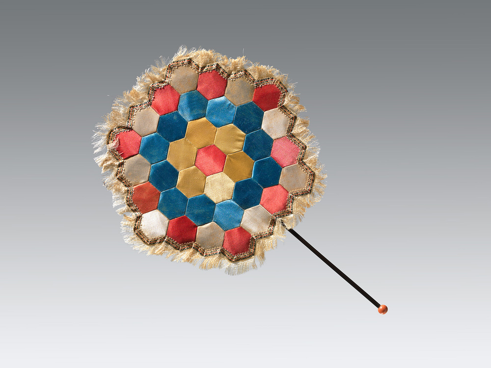 Vaste waaier met blad aan twee gekleurde zijde, gespannen over tussenvoering. De voorkant bestaat uit vier kleuren zijde aan elkaar genaaid met patchwork techniek. De achterkant is gele zijde. De randen zijn afgezet met een band met franje.
