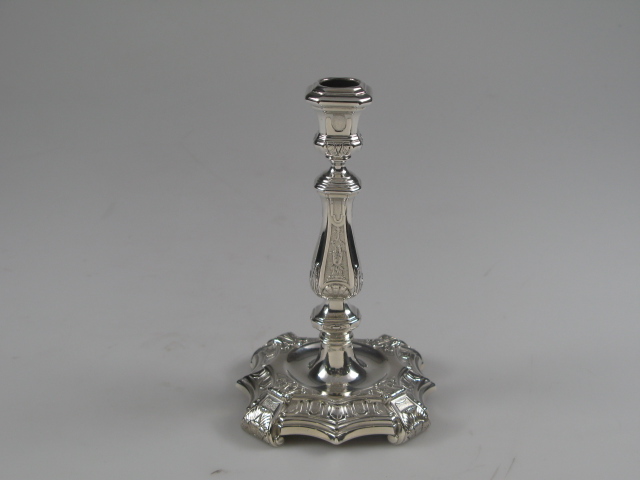 Kandelaar met vierkante, geprofileerde voet met ingezwenkte zijden en afgeschuinde hoeken, de bovenzijde concaaf. Op voet gestileerde lambrequins, de hoeken met omkrullende schelpen, palmet- en acanthusbladeren op een geponste ondergrond. Balustervormige stam met vierkante nodus, de zijden met rozetten op geponste ondergrond en afgeschuinde hoeken. Zijden baluster met lambrequins, schelpen, acanthusbladeren op een deels geponste ondergrond, de hoeken met palmetten. Vaasvormige kaarsenhouder met afgeplatte hoeken en geprofileerde randen. Op lichaam kaarsenhouder afhangende palmetten en geponste ovale medaillons. Op voet is later het helmteken van de graven van Listowel (Ierland) gegraveerd. Sporen van vergulding. Onder voet is later gegrift: No 954 2/OZ 68-2, £ ea=ww=x, de prijs in geheimschrift.