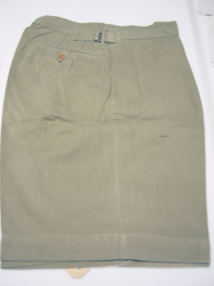 Mannenshorts van kakikleurig katoen ripsstof, met zijzakken en 12 achterzak; sluiting van de broekband met 2 bruine bakelieten (?) knopen; gulpsluiting 6 metalen knopen; 5 trensen voor een riem; lipjes met een metalen gesp voor het verstellen van de taille. Aan de voorste lipjes knoop een knoopsgat, zodat de gespjes voor het wassen verwijderd kunnen worden.