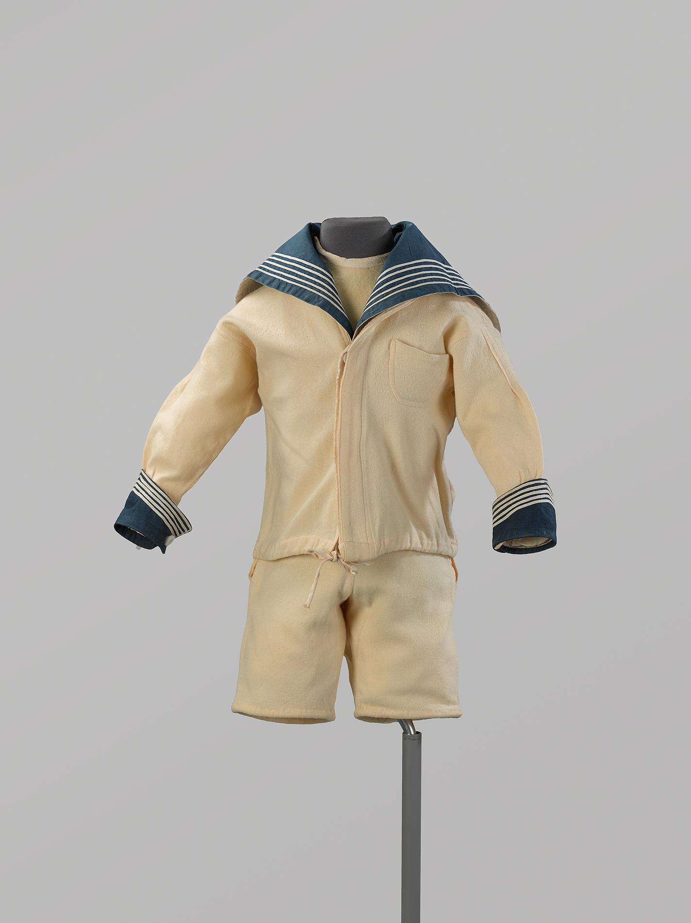 Matrozenpakje van crèmekleurig flanel; 2-delig met losse kraag, manchetten en bef. Het broekje heeft aan de achterkant een klep, die in de taille bevestigd is met 3 stof overtrokken knopen. Aan de broek is een katoenen lijfje bevestigd, zonder mouwtjes, dat van achteren gesloten wordt met 4 stof overtrokken knopen; de middelste knoop van de klep dient als onderste knoop van de sluiting van het lijfje. Het geheel is met wit katoen gevoerd.
