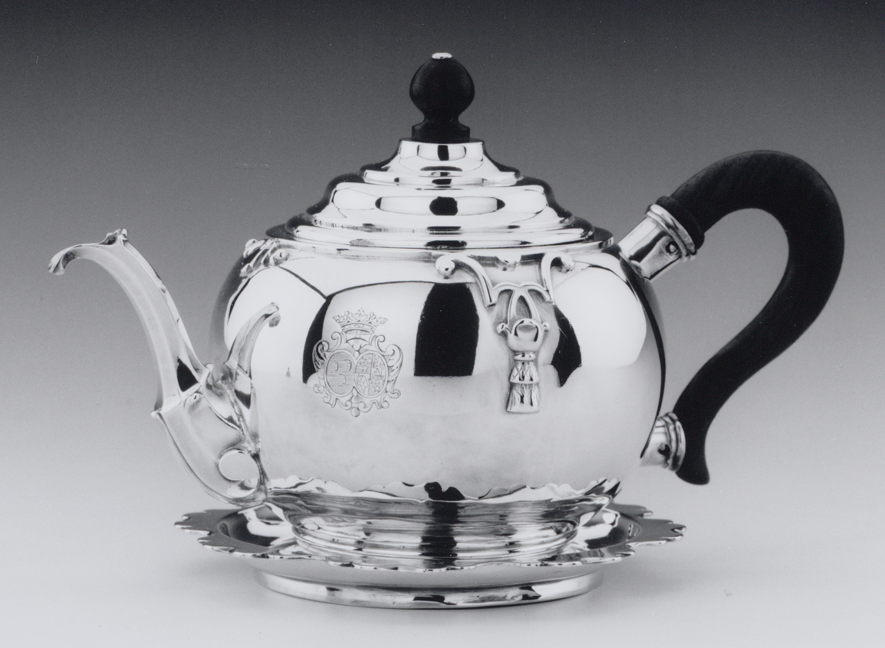 Theepot met bolvormig lichaam en gewelfd los deksel op ronde pattipan met geschulpte rand. Theepot met geprofileerde voet, overgaand in glad lichaam, de bovenrand opgelegd met twee lambrequins aan de zijkanten en een palmet boven de tuit. Achtzijdige, S-vormige schenktuit met verdikte gefacetteerde aanzet. C-vormig oor van palissanderhout in zilveren vattingen. Geprofileerd deksel met bolvormige knop van palissanderhout. Pattipan of onderschotel met vlakke, geschulpte rand. Lichaam theepot en middenstuk pattipan gegraveerd met familiewapen van Carel van Naerssen en Johanna Catharina van der Heijden de Gouda. Op 23 oktober 1724 te Breda traden zij met elkaar in het huwelijk.