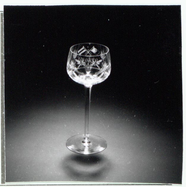 Helder kleurloos glas. Licht conische voet. Hoge gefacetteerde stam. Bolvormige kelk, de basis in schnitten en waaiers geslepen. Op kelk het opschrift: OPORTO/. Op andere zijde de gekruiste vlaggen van Nederland en Portugal.