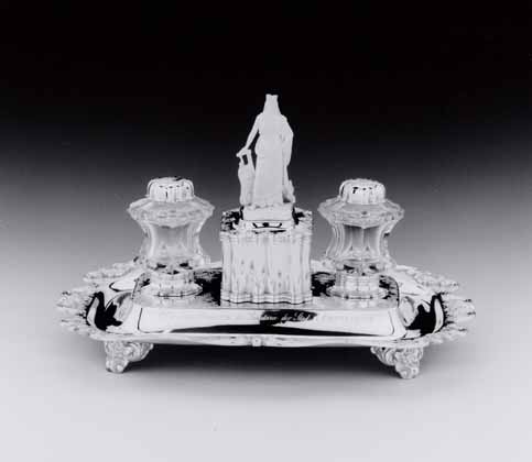 Inktstel met ouweldoosje en twee zeslobbige glazen potjes voor inkt en zand. Rechthoekig voetstuk met afgeronde hoeken en cartouchevormige rand met schelpen en bladeren. Gladde concave binnenrand, overgaand in verhoogd middenstuk. Vier pootjes met bloemen en voluten. Op voetstuk rechthoekige geschulpte houder met omsluitend deksel en profielranden op onderzijde houder en deksel. Deksel met verhoogd middenstuk waarop een ivoren vrouwenfiguur met het stadswapen van Amsterdam en een leeuw, de personificatie van de stedenmaagd. Aan weerszijden houder een geprofileerd voetstuk voor de glazen potjes. Potjes met gladde zilveren hals, zandpotje met opengewerkte bovenzijde. Omsluitend half bol geschulpt deksel. Op rand, verhoogd midden voetstuk, deksel houder en deksels potjes zijn deels geruwde bloem- en bladranken gegraveerd. Op voorzijde voetstuk is gegraveerd: aan den Heer Secretaris Mr. Vaillant 12 mei 1855./. Op achterzijde voetstuk: De Ambtenaren der stadt AMSTERDAM/.