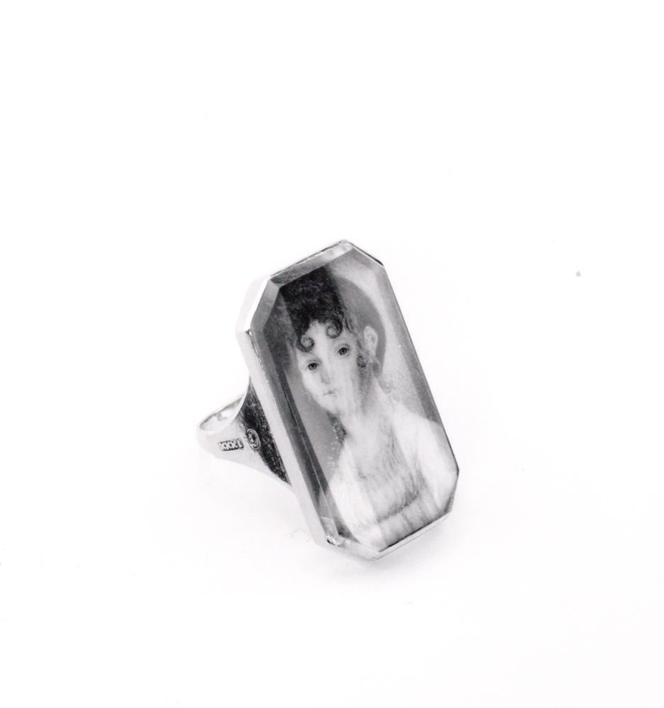 Ring met zich naar de zetting toe verbredende scheen. Gebogen rechthoekige zetting met afgeschuinde hoeken en op ivoor geschilderd portretminiatuur van een niet-geïdentificeerde dame, gemonteerd achter glas met geslepen rand.