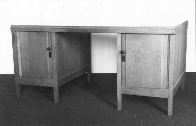 Rechthoekig blad gedragen door twee kastjes op elk vier pootjes. In kastjes drietal laden met verlaagd front.- Trefwoorden