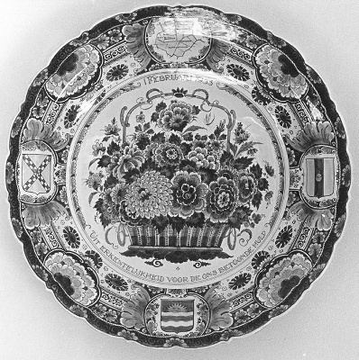 plattegrond van Zonnemaire met de polders en de wapens van de betreffende Gemeenten. Op het plat een jardinière, gevuld met bloemen- Trefwoorden