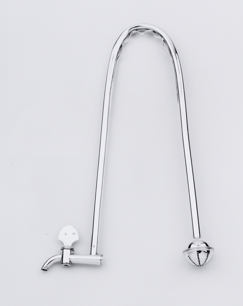 Wijnhevel met U-vormig gebogen buis. Het ene uiteinde met conische kraan en waaiervormige tap, het andere uiteinde met holle knop met kabelrand, de onderste helft geperforeerd en afschroefbaar. Welving buis verstevigd met gegolfde zilveren strip.