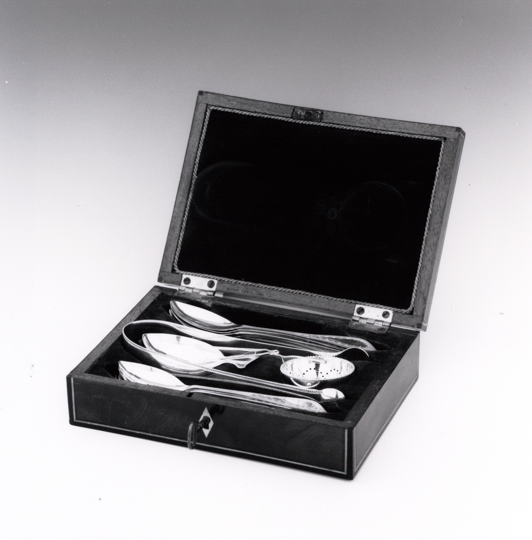 Dit theegarinituur is later samengesteld. Bij het ritueel van het theedrinken was een uitgebreid assortiment aan zilveren gebruiksvoorwerpen benodigd. In het tweede kwart van de negentiende eeuw kwamen dozen in uiteenlopende materialen in gebruik ter opberging van het kostbare theegoed (Nederlandse 1975).