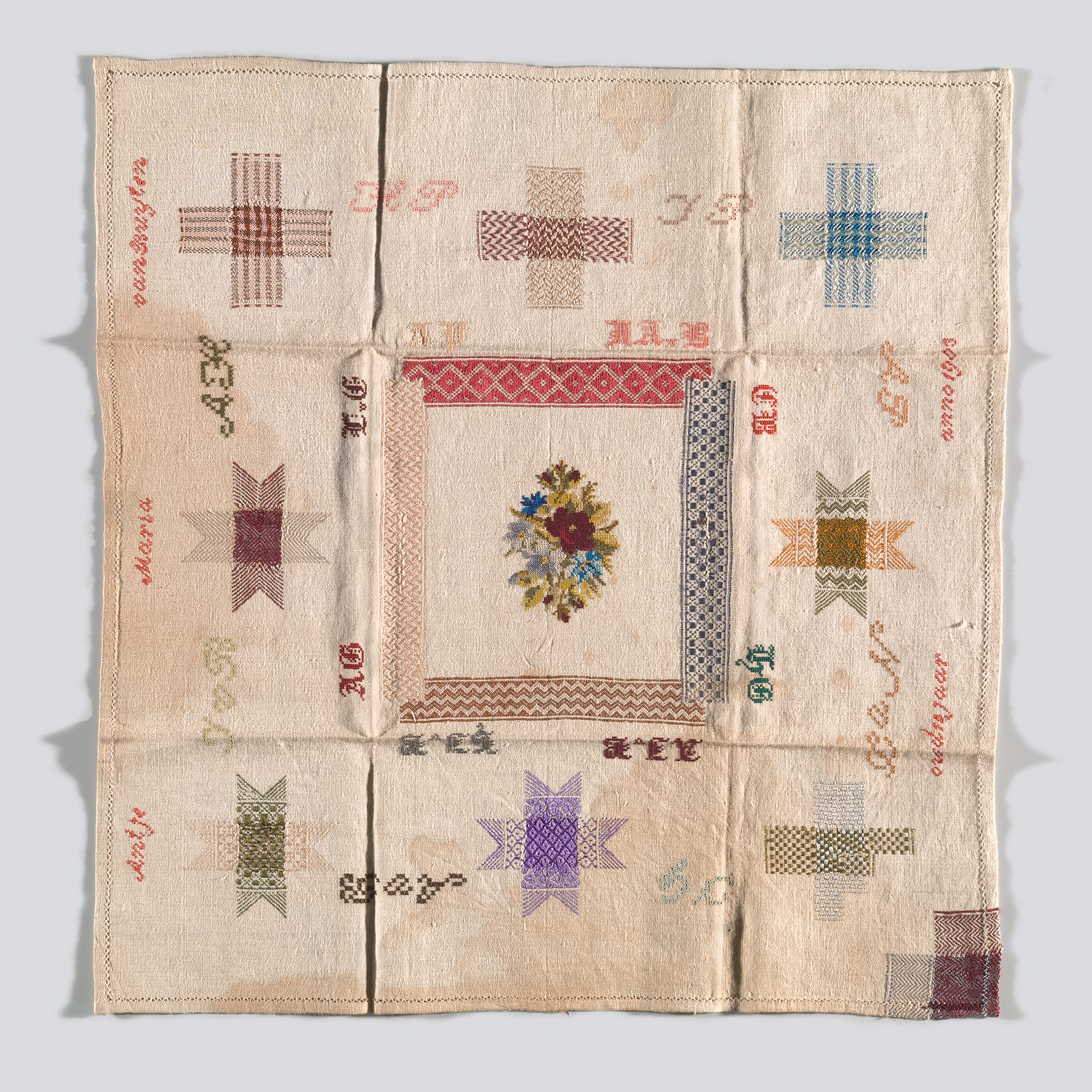 opschrift regel tegen bovenrand doek, uitgelijnd: Antje / Maria / van Buyten: naam borduurster
