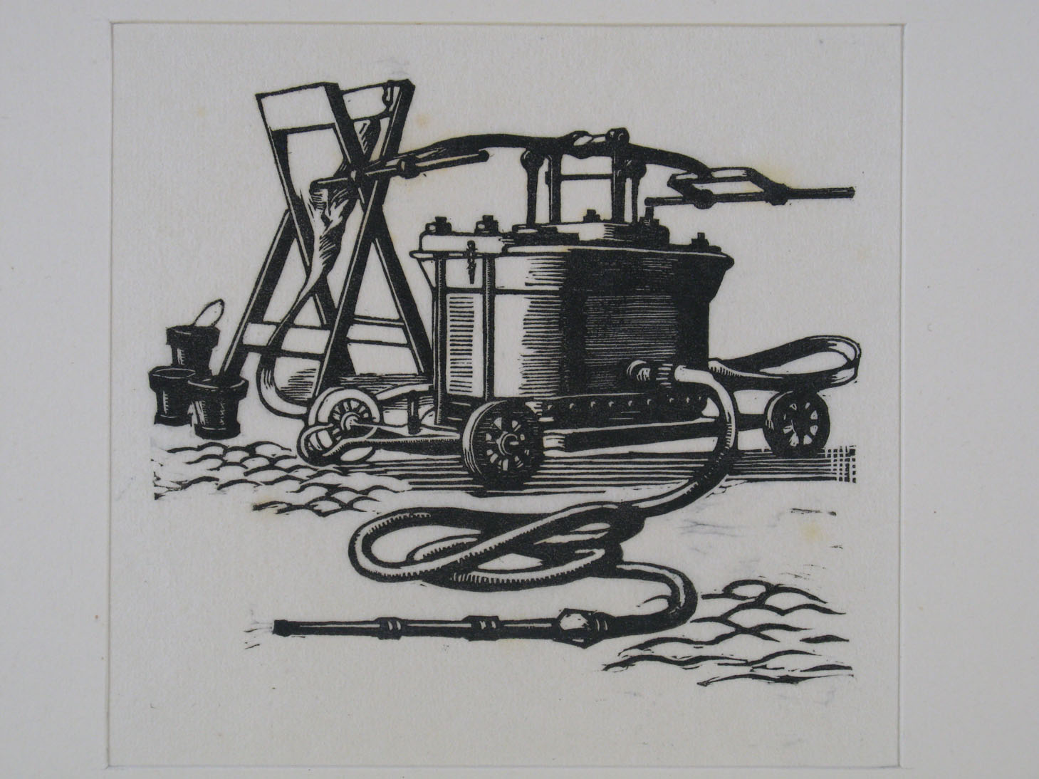 - Houtsnede van het eerste model brandspuit uitgevonden door Jan v/d Heyden, 1934 - 1935