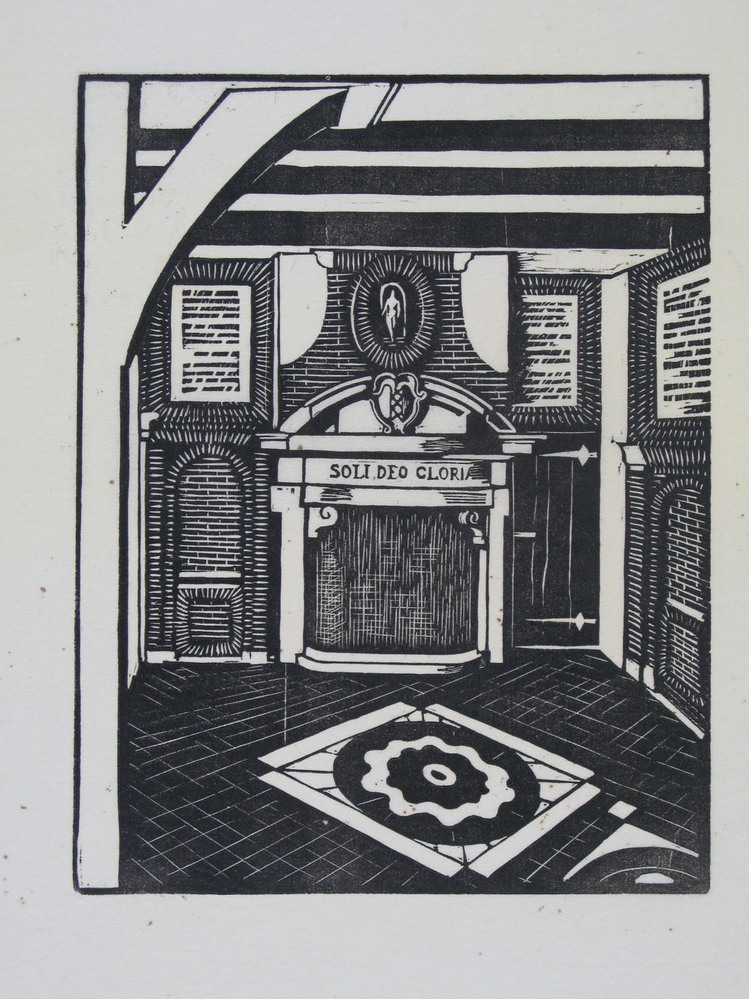 - Houtsnede van de schouw in de gildekamer der metselaars, 1934 - 1935
