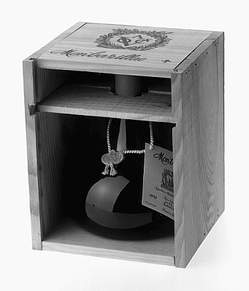 Replica van een wijnfles uit het schip Amsterdam (1749) van de VOC, verpakt in een houten kistje en gevuld met wijn (Monbazillac). De replica is gemaakt in opdracht van de Stichting VOC-schip 'Amsterdam' in samenwerking met de producenten van Monbazillac (Frankrijk). ( Annemarie den Dekker)