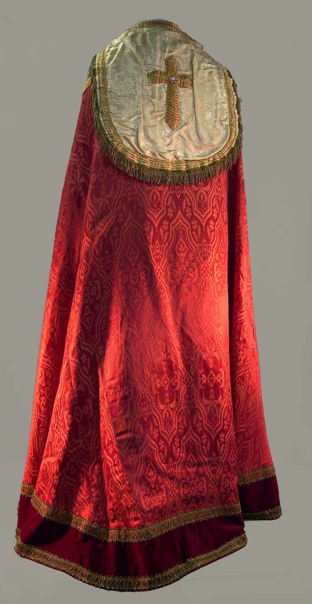 Donkerrood brokaat koorkapmodel (halve cirkel), achter uitlopend in een sleepje; op de rug een verstevigd los rugstuk. Langs de onderzijde een 15 cm. brede strook van donkerrood fluweel, hals en randen zijn afgezet met goudkleurig galon, de mantel is gevoerd met gele zijde. Rugstuk van wit brokaat, goudgele zijde in keperbinding, met een versteviging als tussnvoering, langs de randen franje van gedraaid goudkleurig draad, in het midden een kruis van gouddraad, opgestopt met rood borduurgaren met in het midden en rozet van bergkristal.