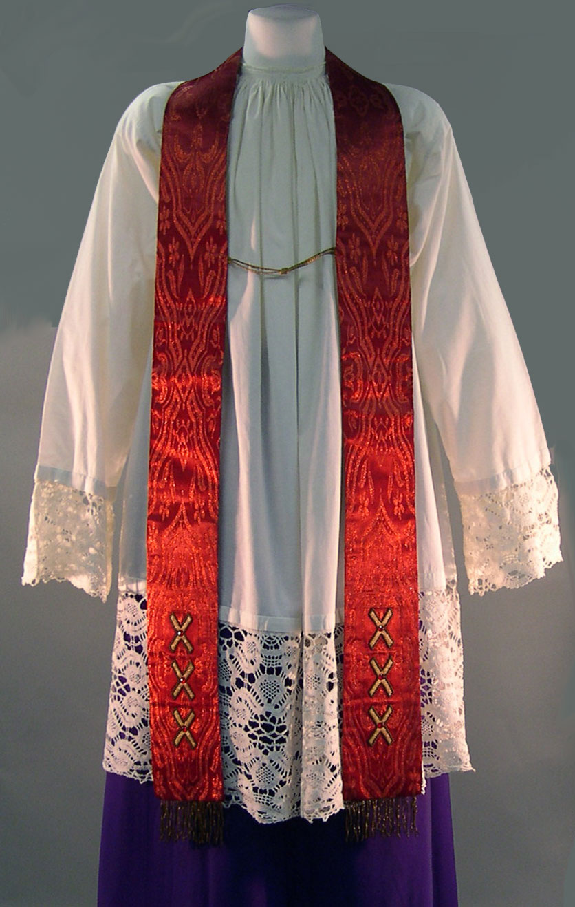 stool van donkerrood brokaat, aan beide uiteinden 3 geappliqueerde Andreaskruisen in goud/bruin brokaat, met een rode, geslepen glazen kraal. Middenachter een kruis, opgeborduurd met geel borduurkatoen. De stool wordt op borsthoogte bijeengehouden door twee goudkleurige platte koorden met een knoop in het midden (cingel), de uiteinden zijn afgewerkt met franje van metaaldraad. De stool heeft een gele voering.