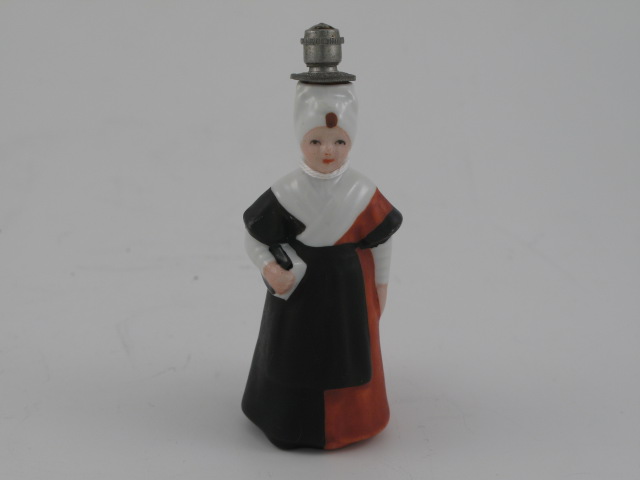 Reukflesje in de vorm van een Burgerweeshuismeisje met op het hoofd een schroefdopje (opening dichtgeseald).- Trefwoorden