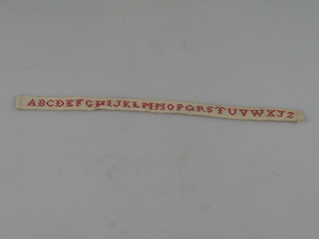 Dit kleine strookje stof is niet breder of langer dan één alfabet. Mogelijk werd het als houvast gebruikt bij het samenstellen van een merk-of letterlap. Een geheugensteuntje. Er is één ander alfabetlint in de collectie, gemaakt door Cornelia Kalff (KA 19352). De meisjes wonen in hetzelfde weeshuis, maar verschillen ruim tien jaar in leeftijd. Mogelijk gaat het om een gangbaar hulpmiddel al zou een alfabet op papier ook volstaan kunnen hebben. Is er sprake van twee vliegen in één klap? Het is uitzonderlijk dat deze kleine werkjes bewaard zijn gebleven. Veel proeflapjes zijn verloren gegaan zijn omdat ze van minder betekenis zijn dan het serieuzere werk in de vorm van merk- stop- en letterlappen. Grietjes lint meet 25,5 x 1,5 cm. Ze heeft rood katoenen borduurgaren op een katoenen band gebruikt. Op grond van haar leeftijd, heeft ze dit lintje mogelijk kort na 1905 gemaakt.