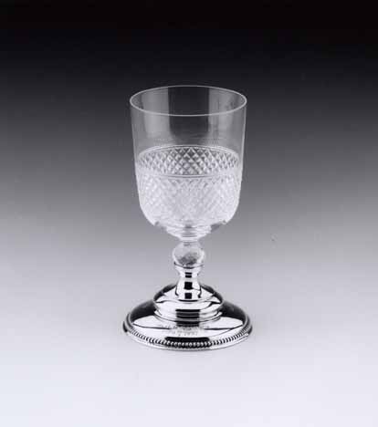 Kelkglas met met meervoudig gewelfde zilveren voet met parelrand. Op voet is gegraveerd: AAN O. HANSEN/ 1870 15-9 1895/ en: VAN MEDEBESTUURDEREN V.D. KOSTHUIZEN/ DER MY V D WERKENDE STAND/. Stam van kleurloos glas met gefacetteerde nodus. Cilindrische kelk met afgeronde basis. Onderste helft kelk in diamanten geslepen.