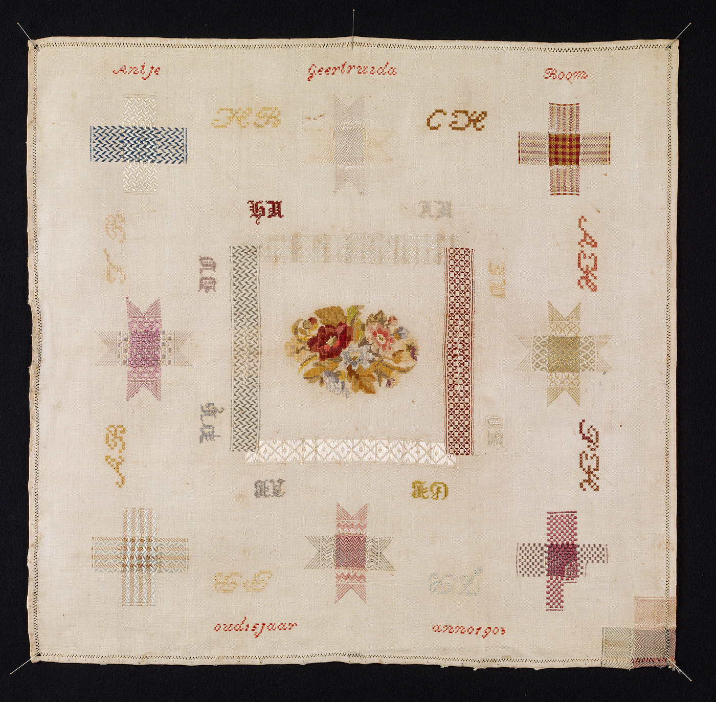 Antje Geertruida Boom wordt op 25 november 1889 in Amsterdam geboren. Ze is het kind van Harmen Boom (1869) uit Loosdrecht en Alida Paulina van Hulst. Het paar krijgt vier jongens en twee meisjes. Vermoedelijk overlijden Alida’s ouders op jonge leeftijd. Antje wordt samen met haar één jaar oudere zus Alida Jacoba (1888-1974) opgenomen in het Burgerweeshuis in Amsterdam. Het stadsarchief bewaart een foto van beide zusjes in weeshuiskostuum. De zusjes worden daar in de nuttige en fraaie handwerken onderricht, met onder andere deze stoplap van Antje als resultaat. Beide zusjes vervolgen hun weg als kinderjuffrouw. Antje treedt op 22 april 1920 in Amsterdam in het huwelijk met de dertien jaar oudere Johan Carel Urban, een chauffeur uit Den Haag. Ze krijgen een zoon die de namen van zijn vader draagt. Of er meer kinderen uit dit huwelijk zijn voortgekomen is niet bekend. Antje overlijdt op 8 maart 1969 in Bloemendaal. Ze is dan 80 jaar. Vermoedelijk heeft zij haar Johan Carel overleefd. Antjes stoplap voldoet aan alle kenmerken van een Burgerweeshuisstoplap. Rondom een middenkader waarin een geromantiseerd motief is aangebracht – in dit geval een uit meerdere bloemen samengesteld boeket - worden acht stoppen geoefend, altererend vier kruisstoppen en vier sterstoppen plus een hoekstop in de rechteronderhoek. Deze stop heeft een hogere moeilijkheidsgraad. Twee van de vier stroken, die samen het middenkader vormen, bestaan uit sneestoppen. De initialen tussen de stoppen verwijzen naar personeel van het weeshuis, familie en soms vriendinnetjes. De leesrichting draait met de klok mee. Aan de bovenzijde heeft zij haar naam geborduurd, tegen de onderrand haar leeftijd en het jaar 1903 waarin zij als vijftienjarige haar stoplap voltooit. De doek meet 48 bij 50 cm. Ze koos voor zijden borduurgarens op een linnen ondergrond. Naast stop- en doorstoptechnieken werkte ze met kruissteek en de dubbele stersteek. De merklap, die doorgaans voorafgaat aan het borduren van een stoplap, is vermoedelijk verloren gegaan.