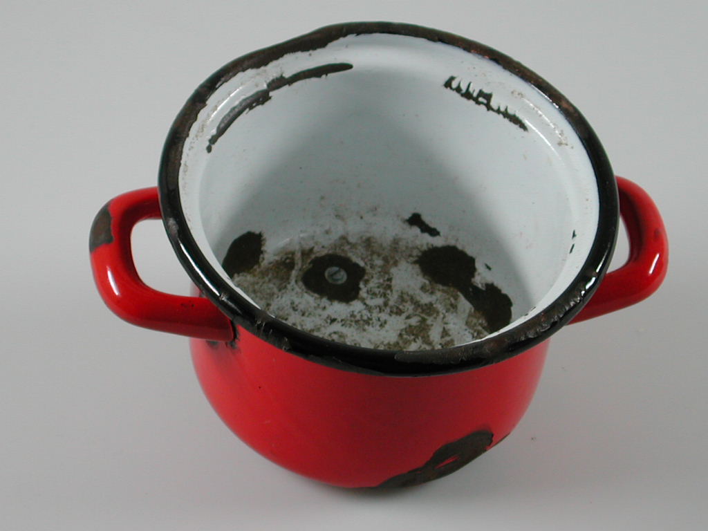 Emaille pannetje, rood aan buitenzijde, wit binnenin en met zwarte rand. Door onderzijde zijn schroeven bevestigd.- Trefwoorden