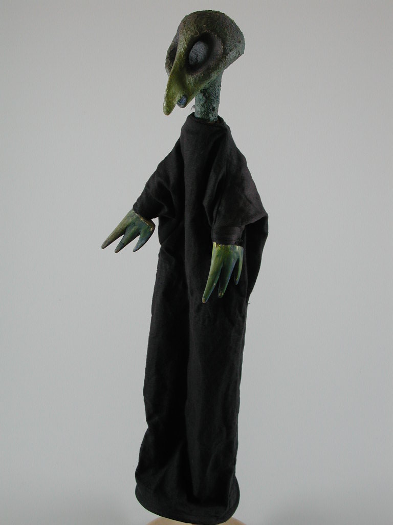 Pop van vreemd wezen met groene kop en zwart gewaad.- Trefwoorden